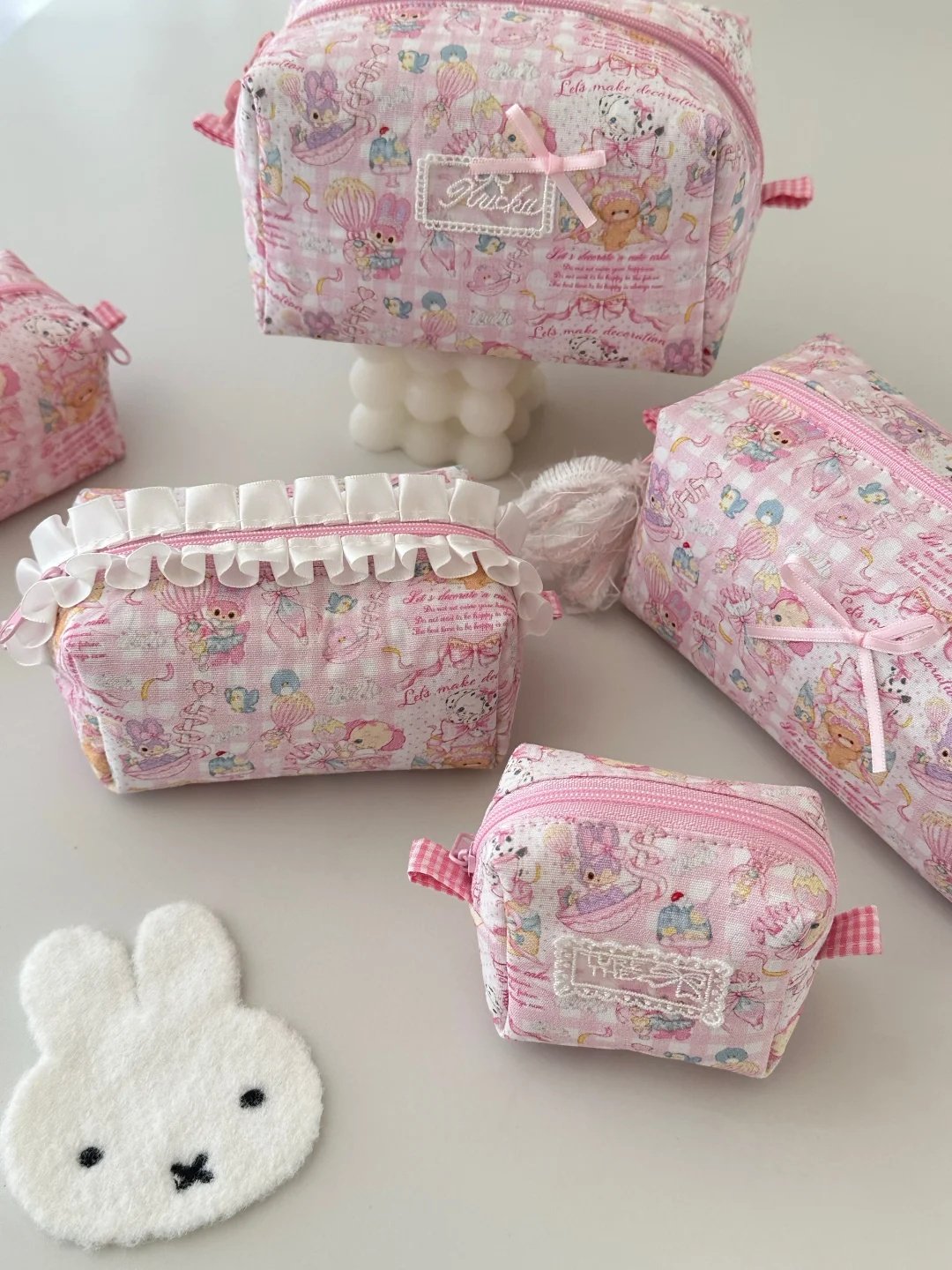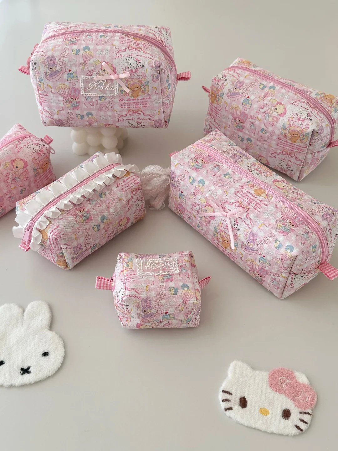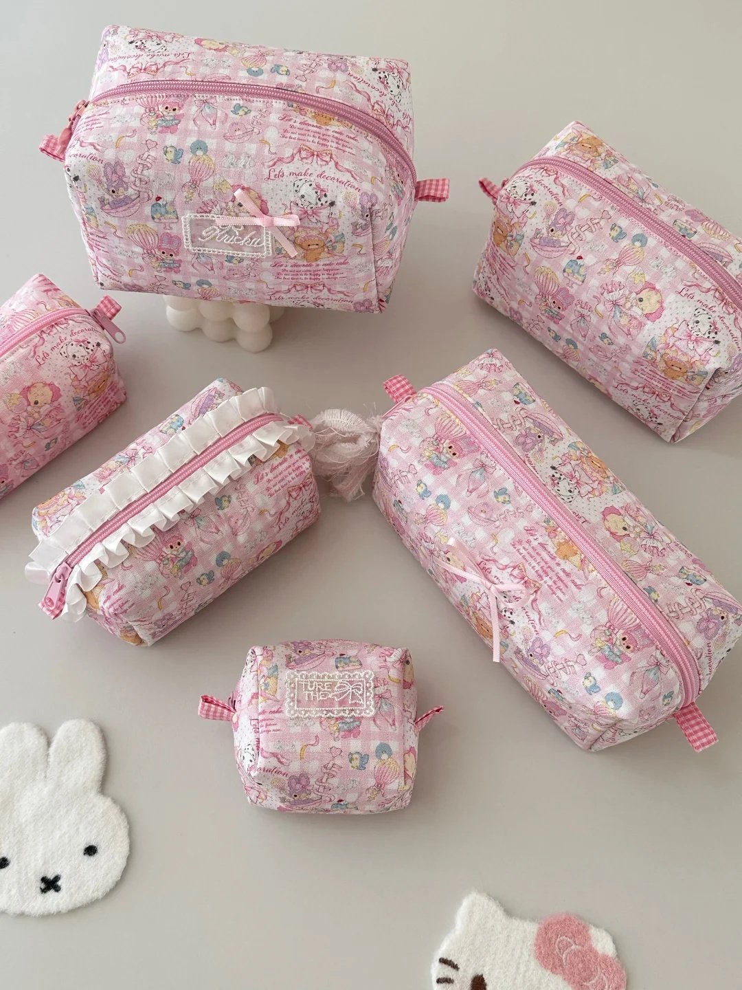 Cute Pink Cartoon Makeup Bag Set – Quilted Cosmetic Pouch for Travel & Daily Storage